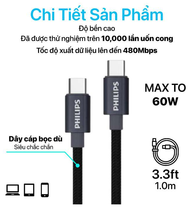 - Cáp Philips USB-C To USB-C 1M USB2.0 MAX 60W - DLC5533 là một loại cáp siêu bền được gia công từ các chất liệu cao cấp, mang đến độ bền vượt trội hơn hẳn so với các loại cáp thông thường trên thị trường. Sự vượt trội này đã được chứng minh qua các thử nghiệm đáng tin cậy. Cùng với khả năng sạc nhanh và truyền dữ liệu tối ưu, bạn có thể hoàn toàn tin tưởng vào độ bền và hiệu quả của sản phẩm này trong việc sạc và truyền dữ liệu cho các thiết bị di động của mình.