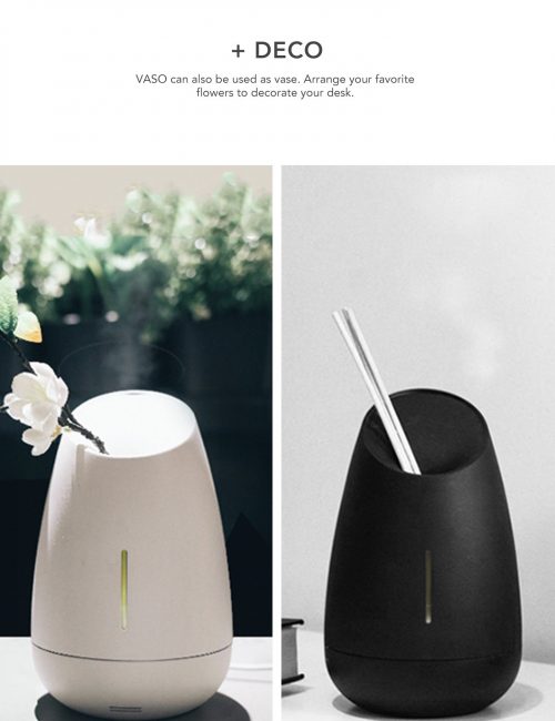 - Ngoài chức năng là máy tinh dầu tỏa hương thông thường, Vaso còn có có kết hợp âm thanh của tiếng nước róc rách, tiếng chim hót hay là những tiếng nhạc tùy chỉnh, nó giống như một khu vườn huyền bí .