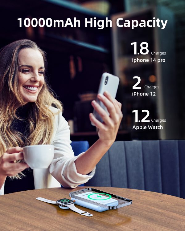 Dung lượng cao 10000mAh: Sạc nhanh Đồng hồ Apple Watch lên đến 22 lần, AirPods lên đến 26 lần và iPhone 14 khoảng 1,8 lần, đồng thời cung cấp thêm 34 giờ phát lại video.